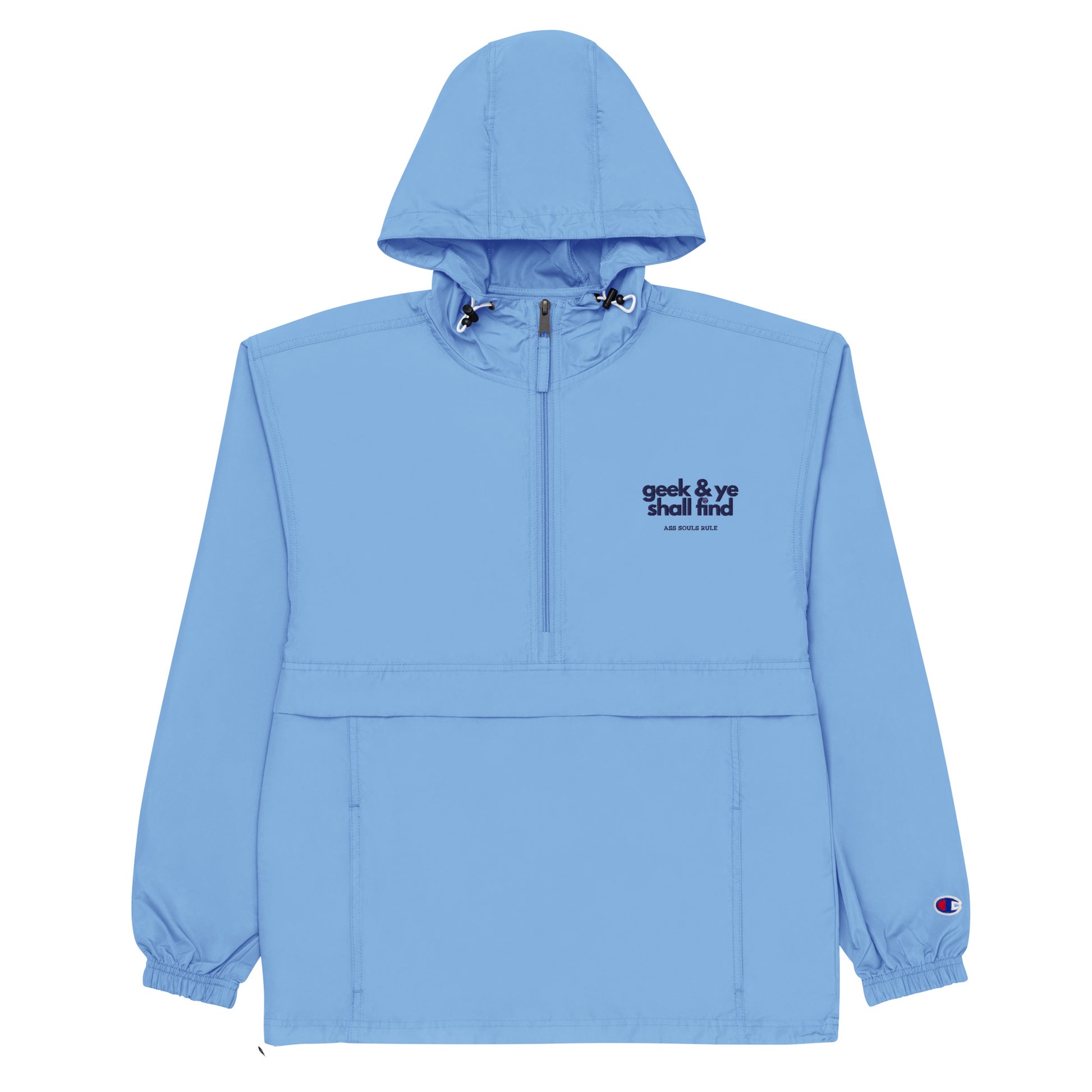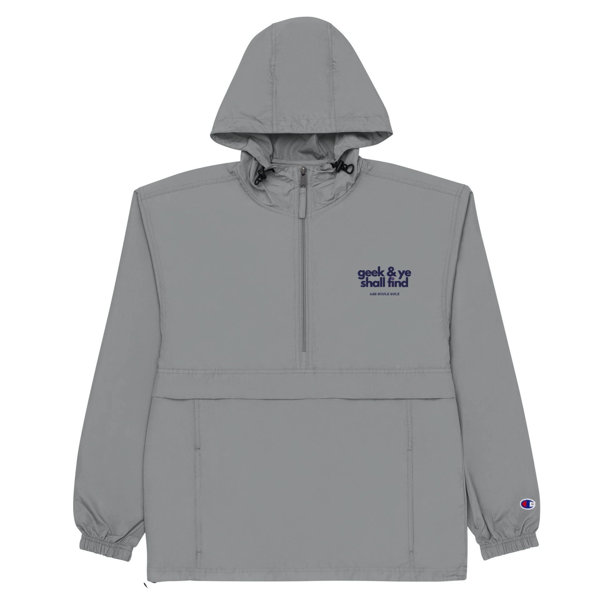 Protect yourself from the elements with this Champion packable Geek & Ye Shall Find jacket. This wind and rain resistant polyester jacket with a detailed embroidery design has a practical hood, front kangaroo pocket, and zipped pouch pocket which you can pull out and use to scrunch the jacket into for convenient storage. Perfect for Ass Souls Rules' School Field Trips.