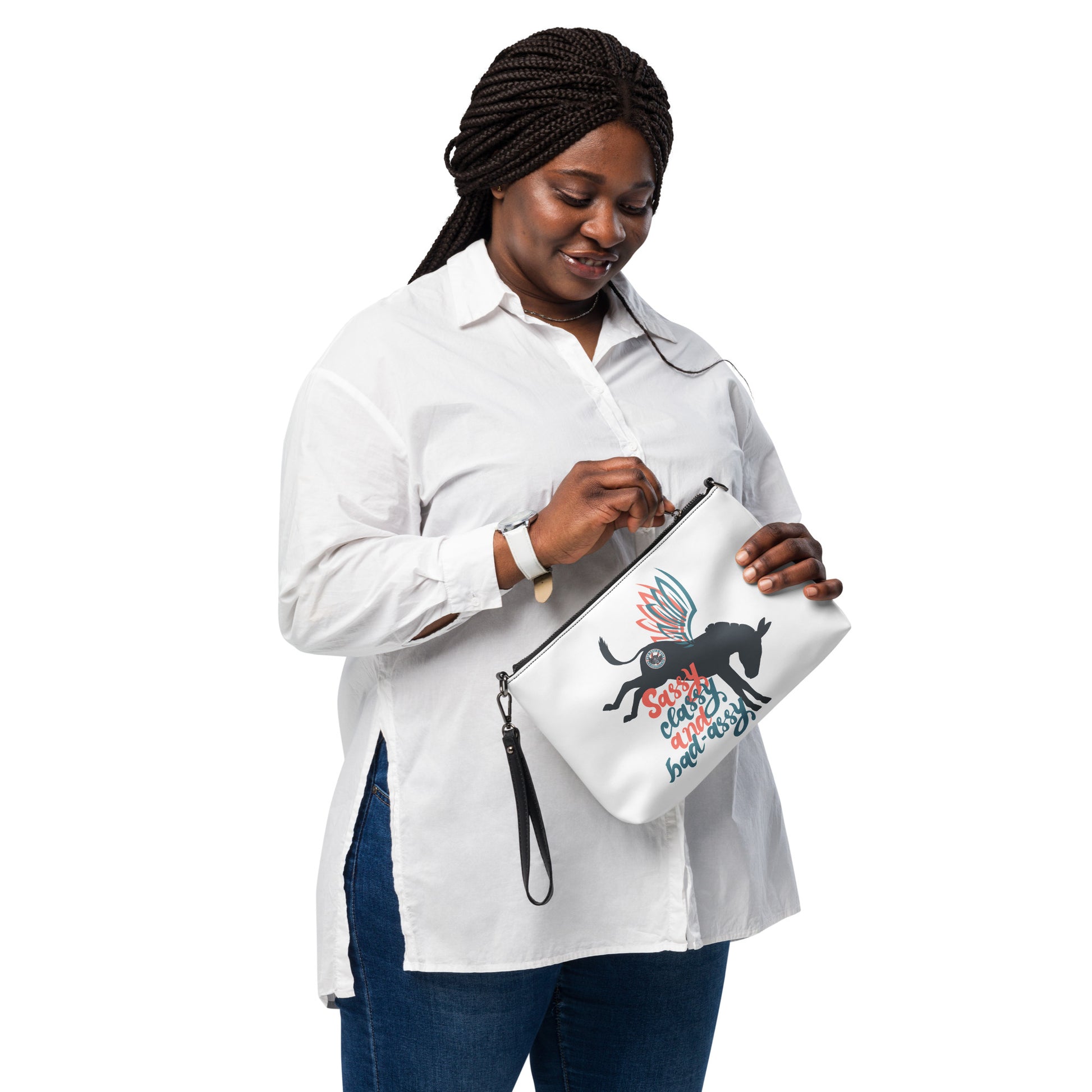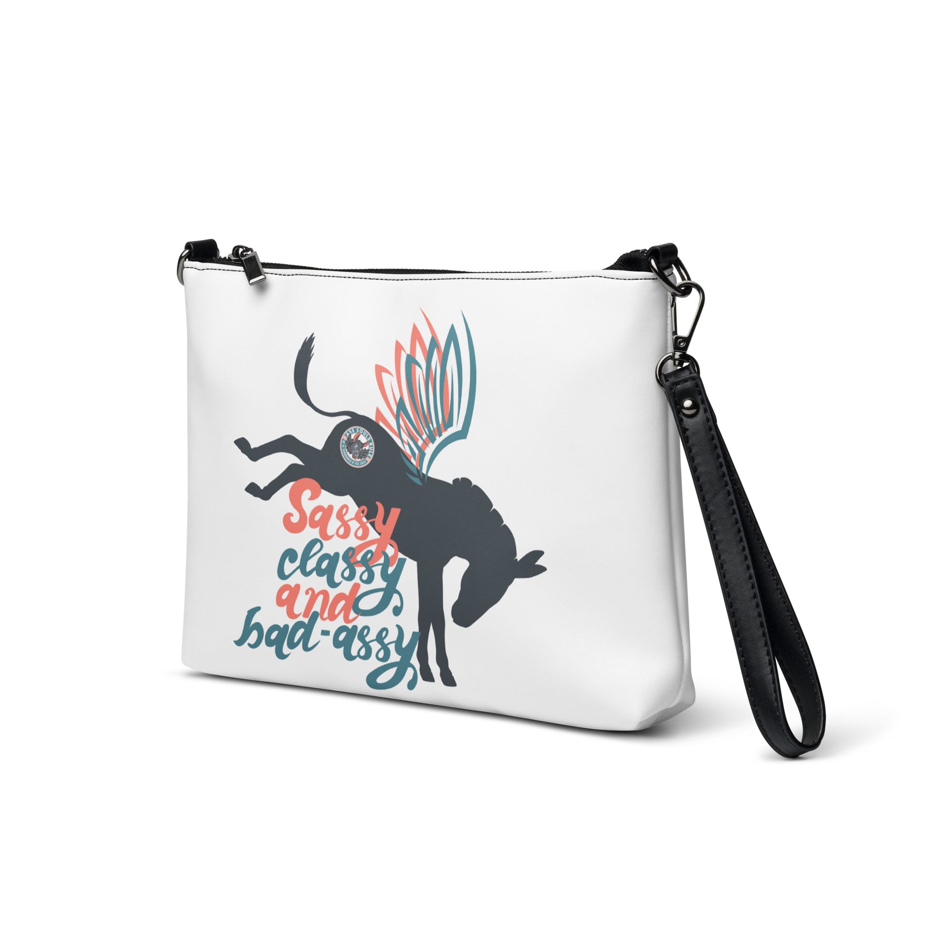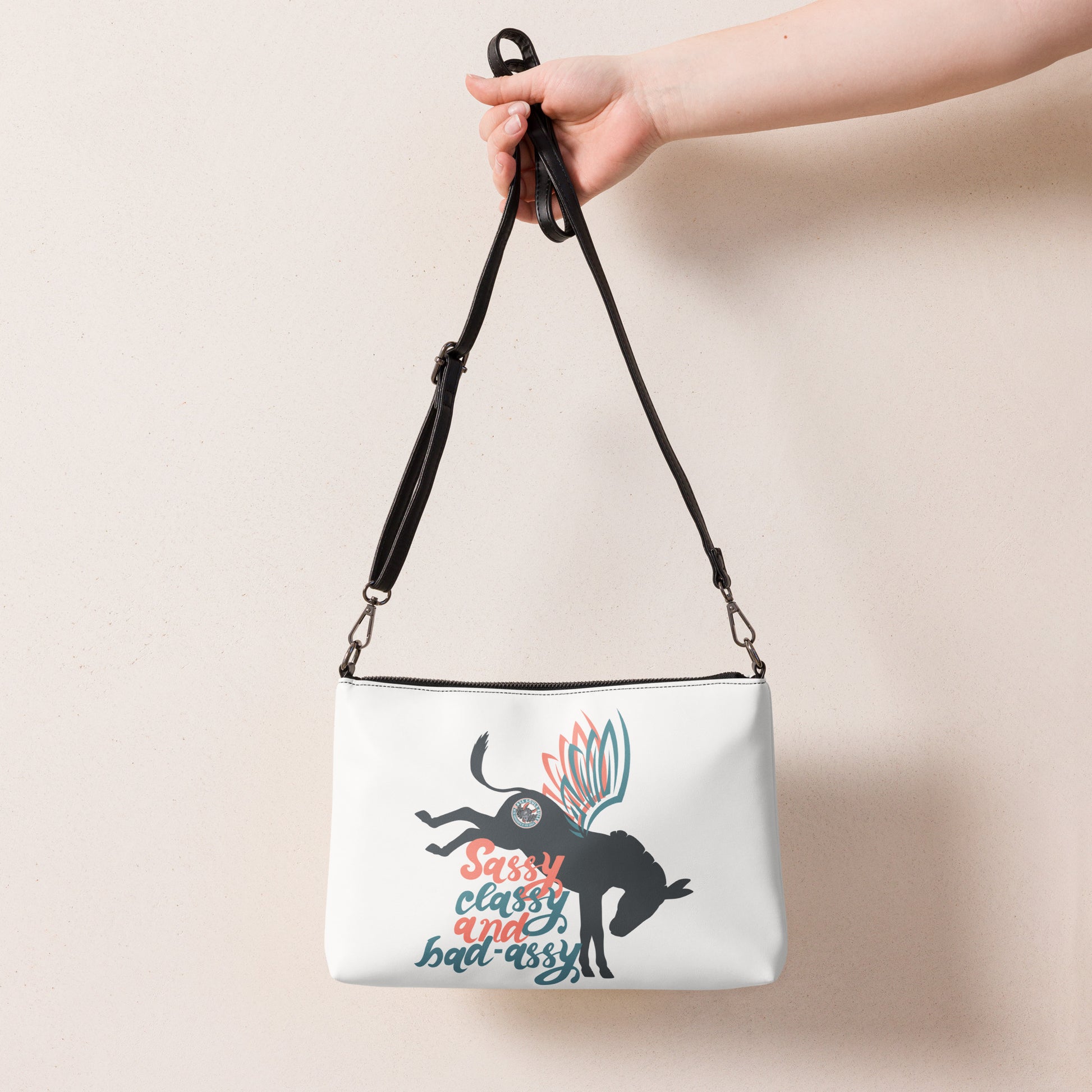 Keep your style on point and your hands free with our versatile Sassy, Classy, & Bad Assy crossbody bag. It’s made of premium faux leather and features dark gray hardware. Thanks to the zip-top closure and multiple inside pockets, you can keep your essentials secure and organized. Transform this Sassy, Classy, & Bad Assy crossbody bag with removable wrist and shoulder straps to style it for day-to-night looks.